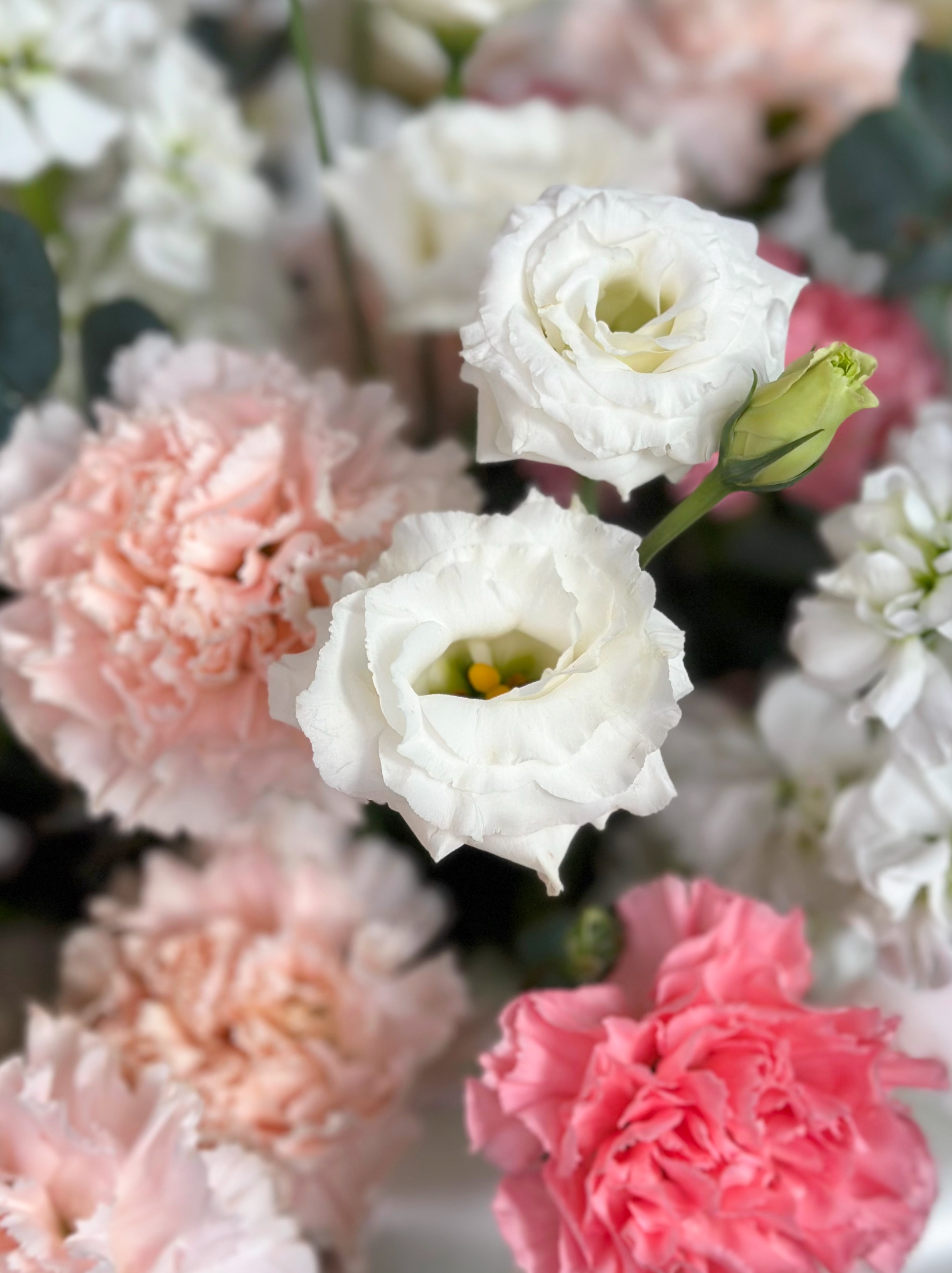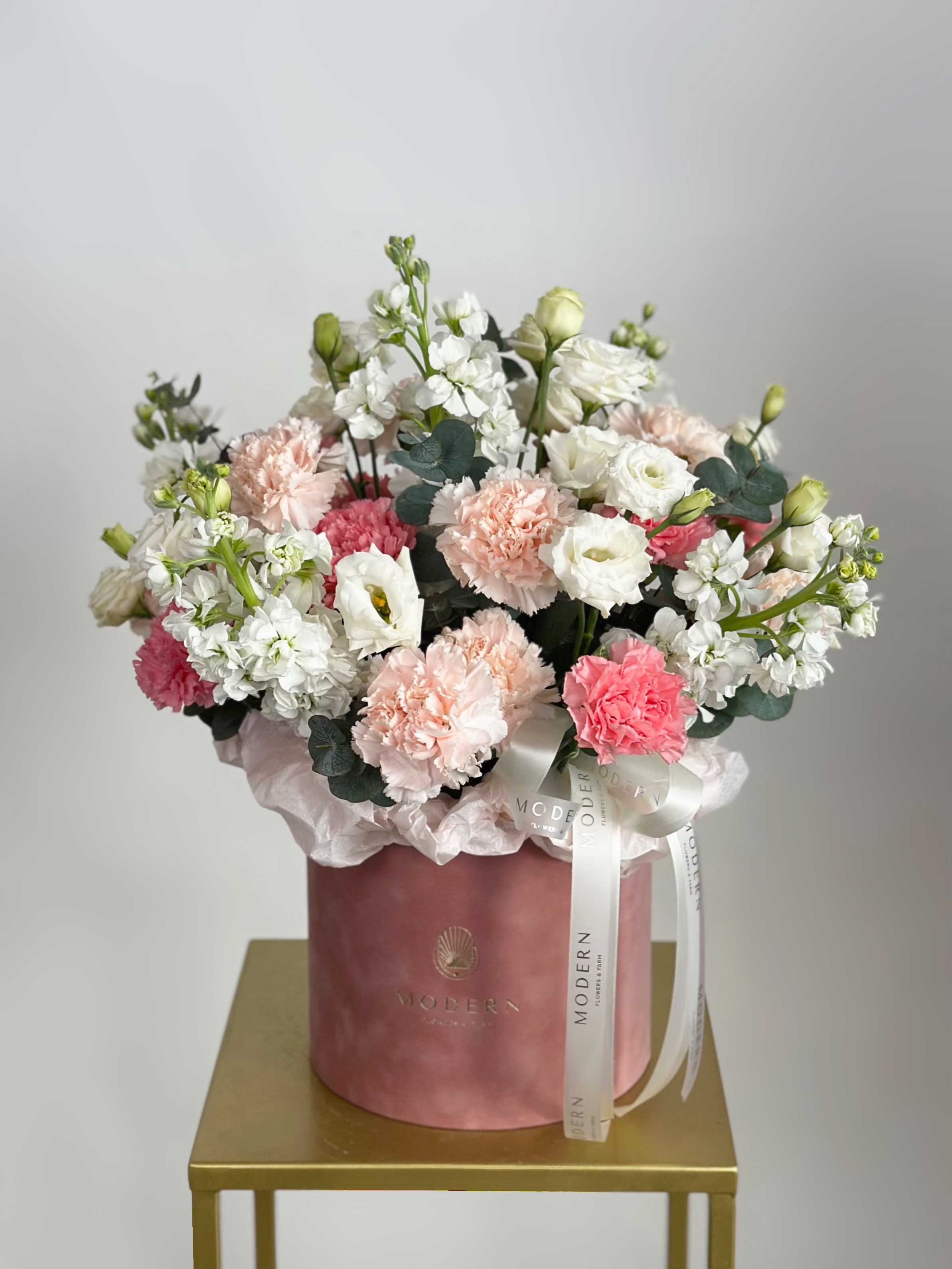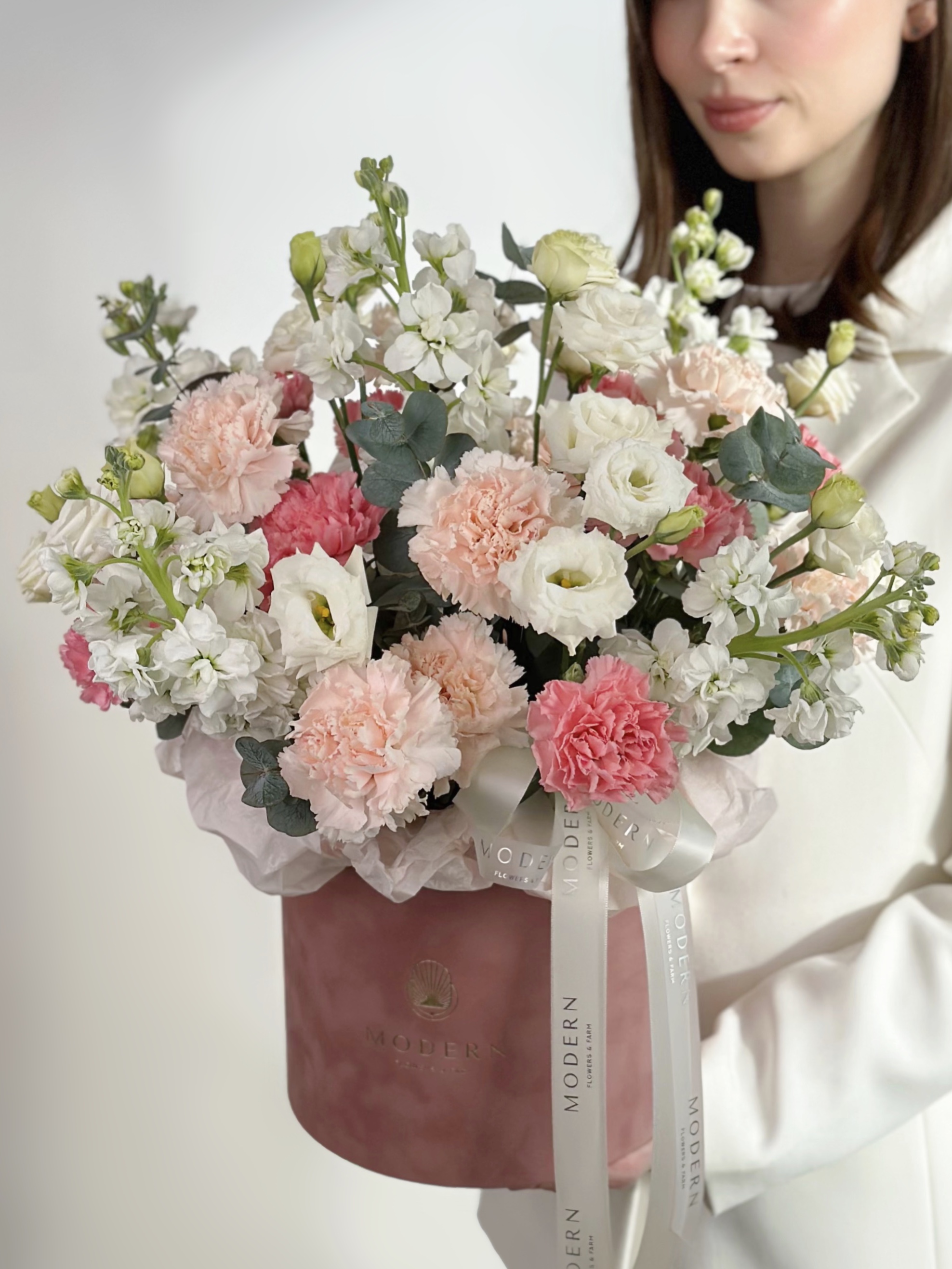 АРОМАТНАЯ МАТТИОЛА, ЭУСТОМА, ЭВКАЛИПТ В БОЛЬШОЙ БАРХАТНОЙ КОРОБКЕ