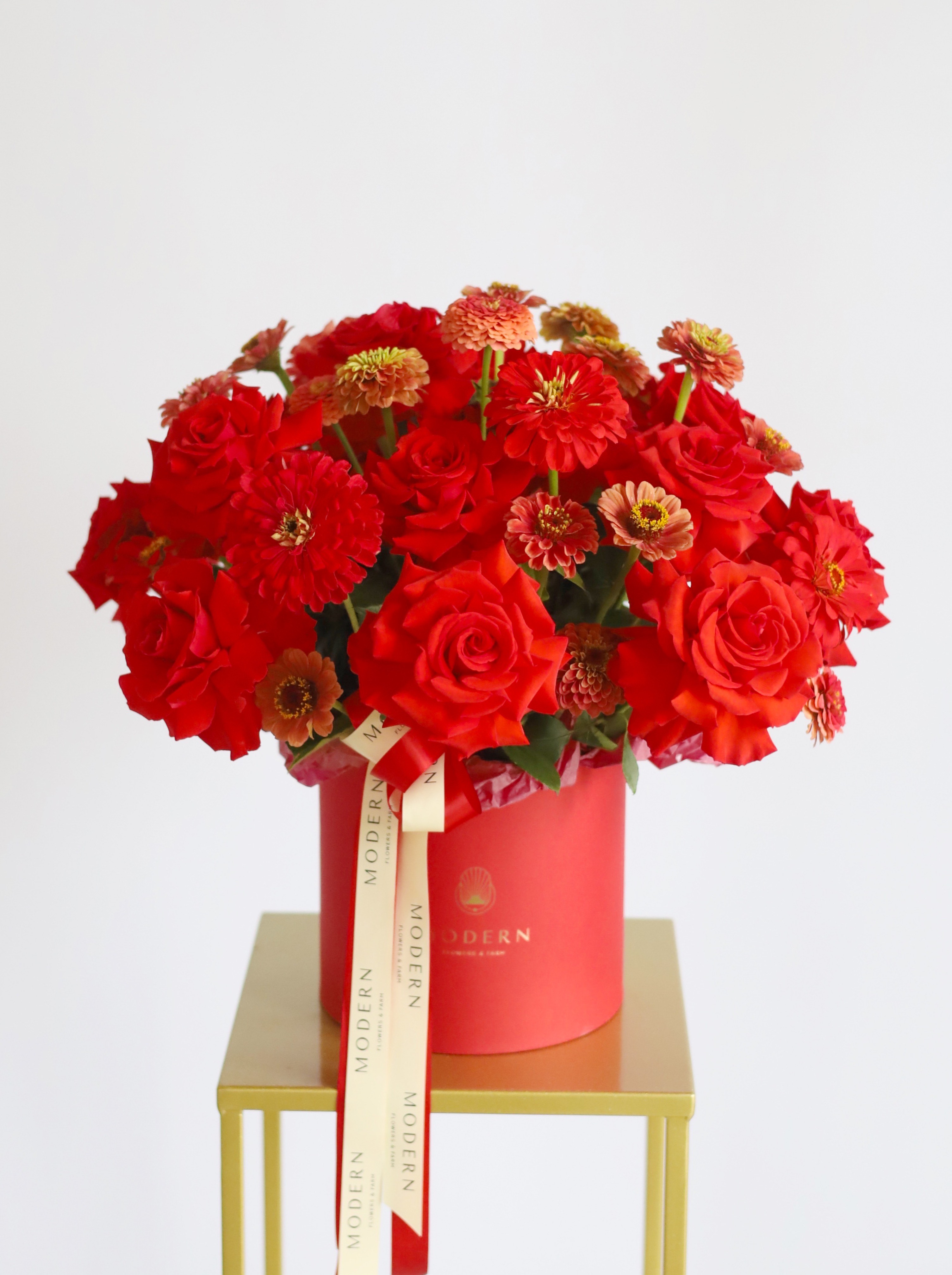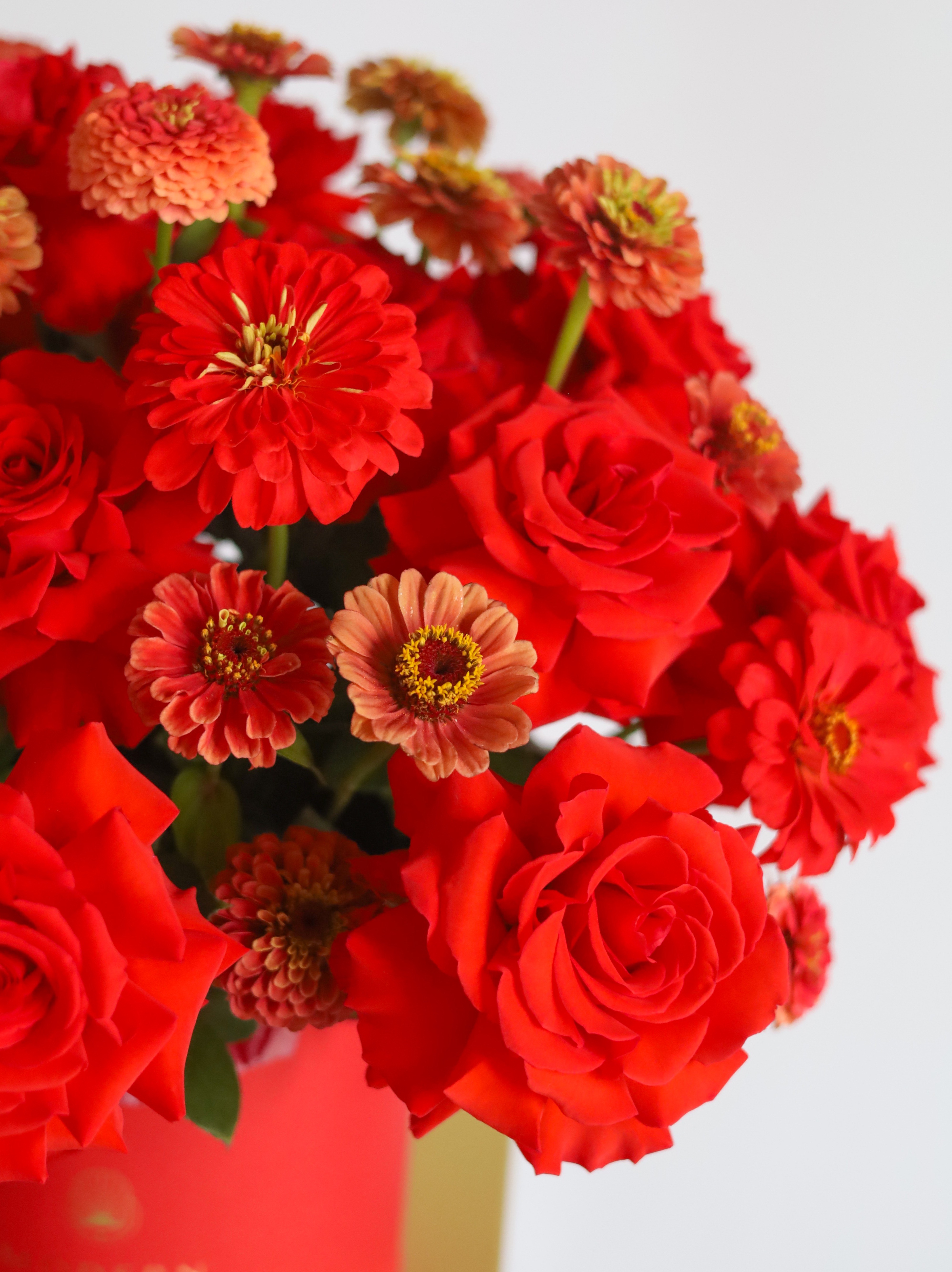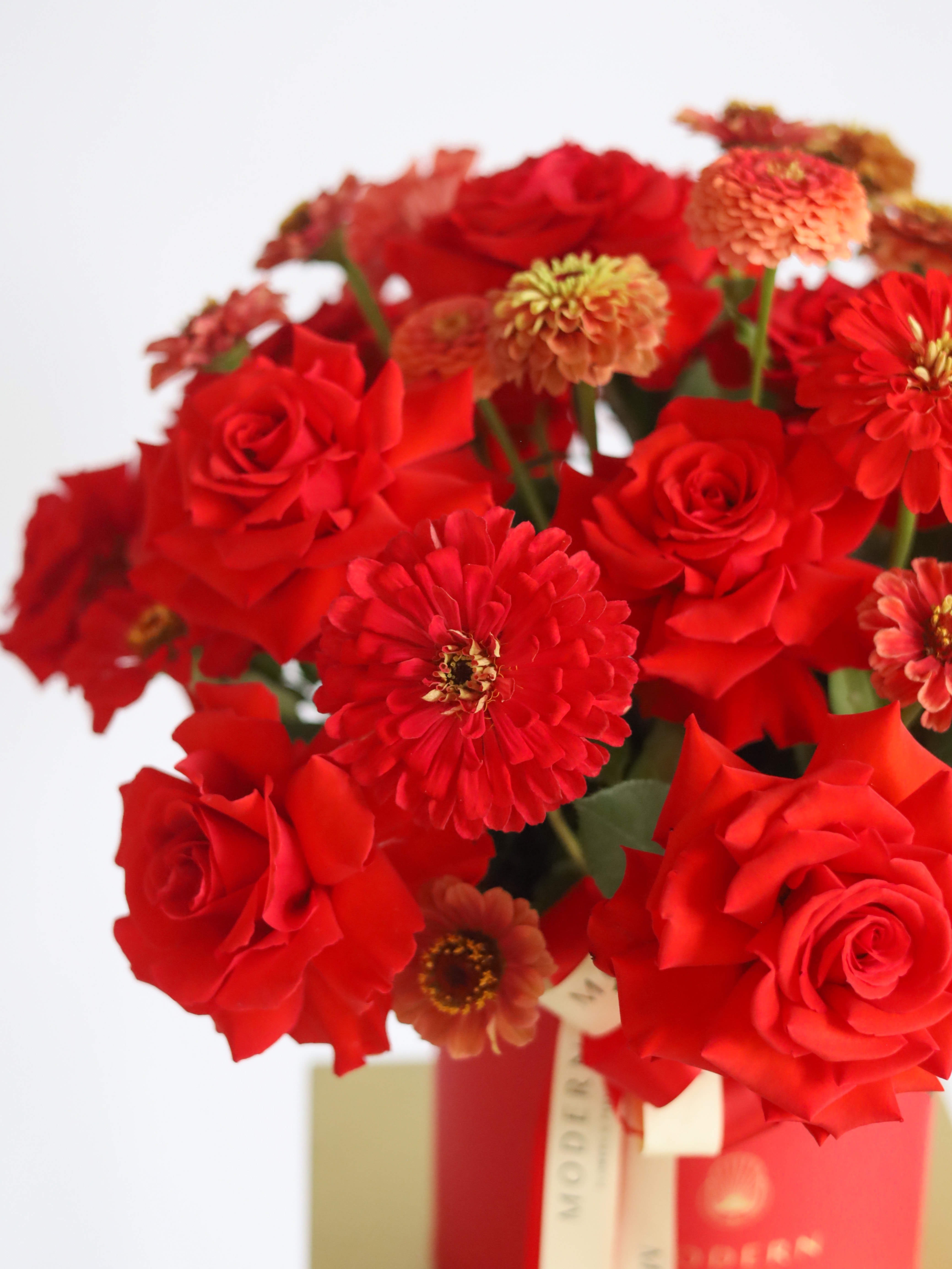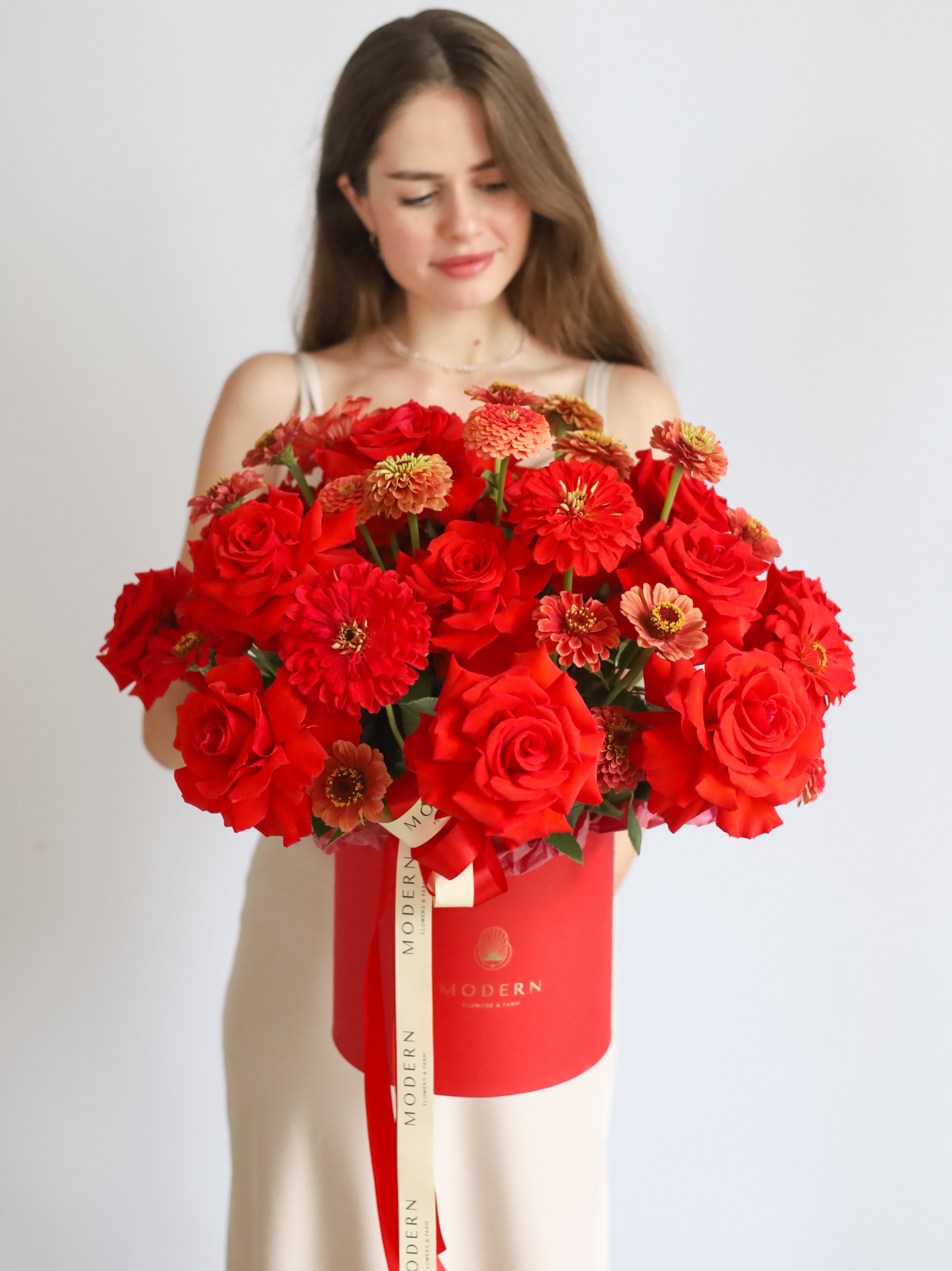 Цинния добавляет композиции яркости и объема, привнося в букет нотки природной свежести и жизнерадостности.