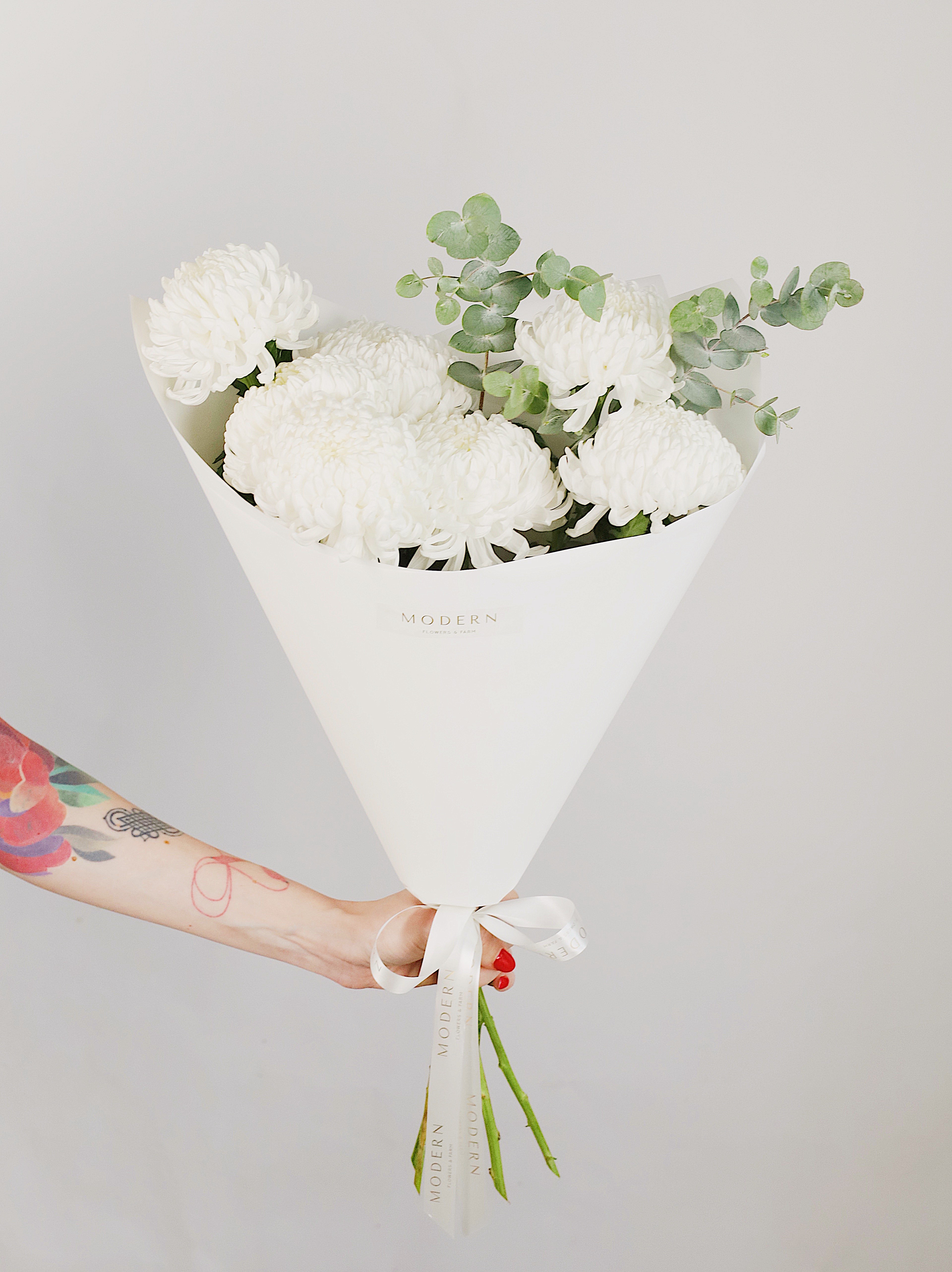 БУКЕТ С БЕЛОЙ ХРИЗАНТЕМОЙ И ЭВКАЛИПТОМ