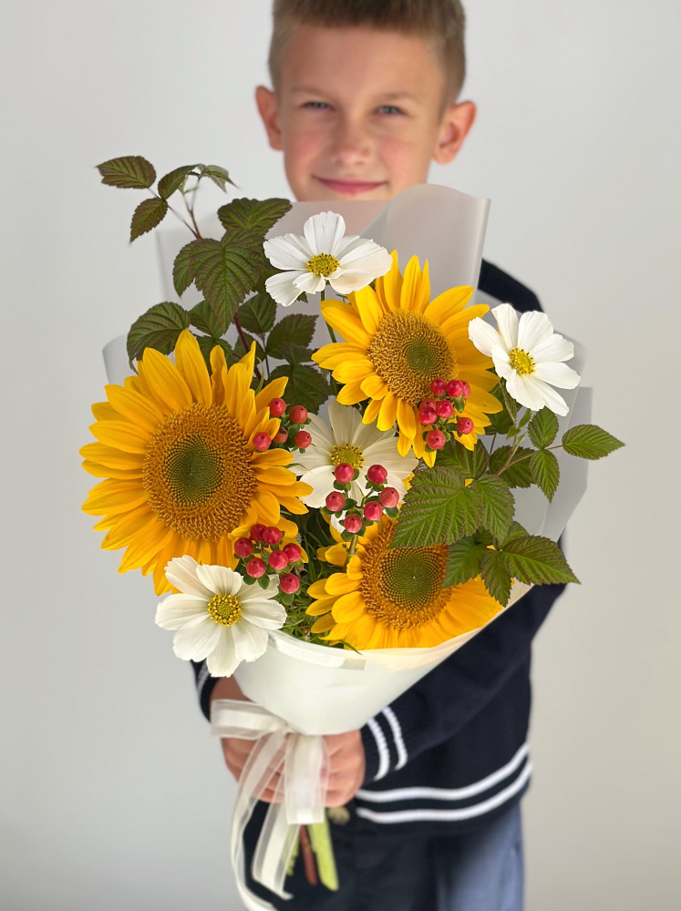БУКЕТ С ПОДСОЛНУХАМИ И КОСМЕЕЙ