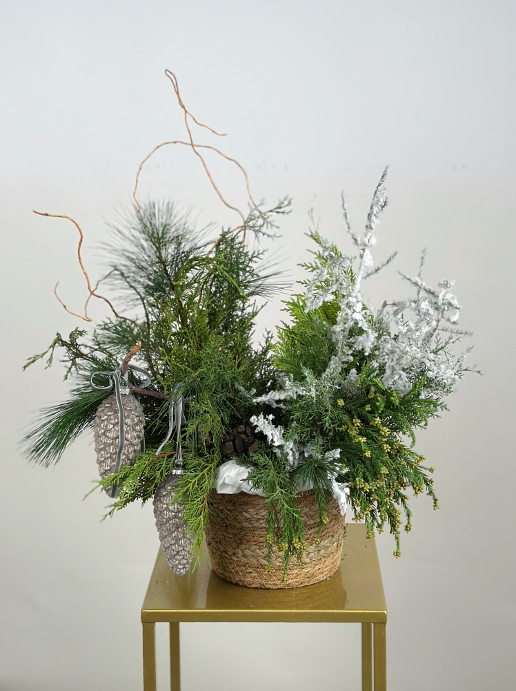 МИКС ХВОИ И ЗАСНЕЖЕННОГО АСПАРАГУСА В КОРЗИНЕ С ДЕКОРОМ