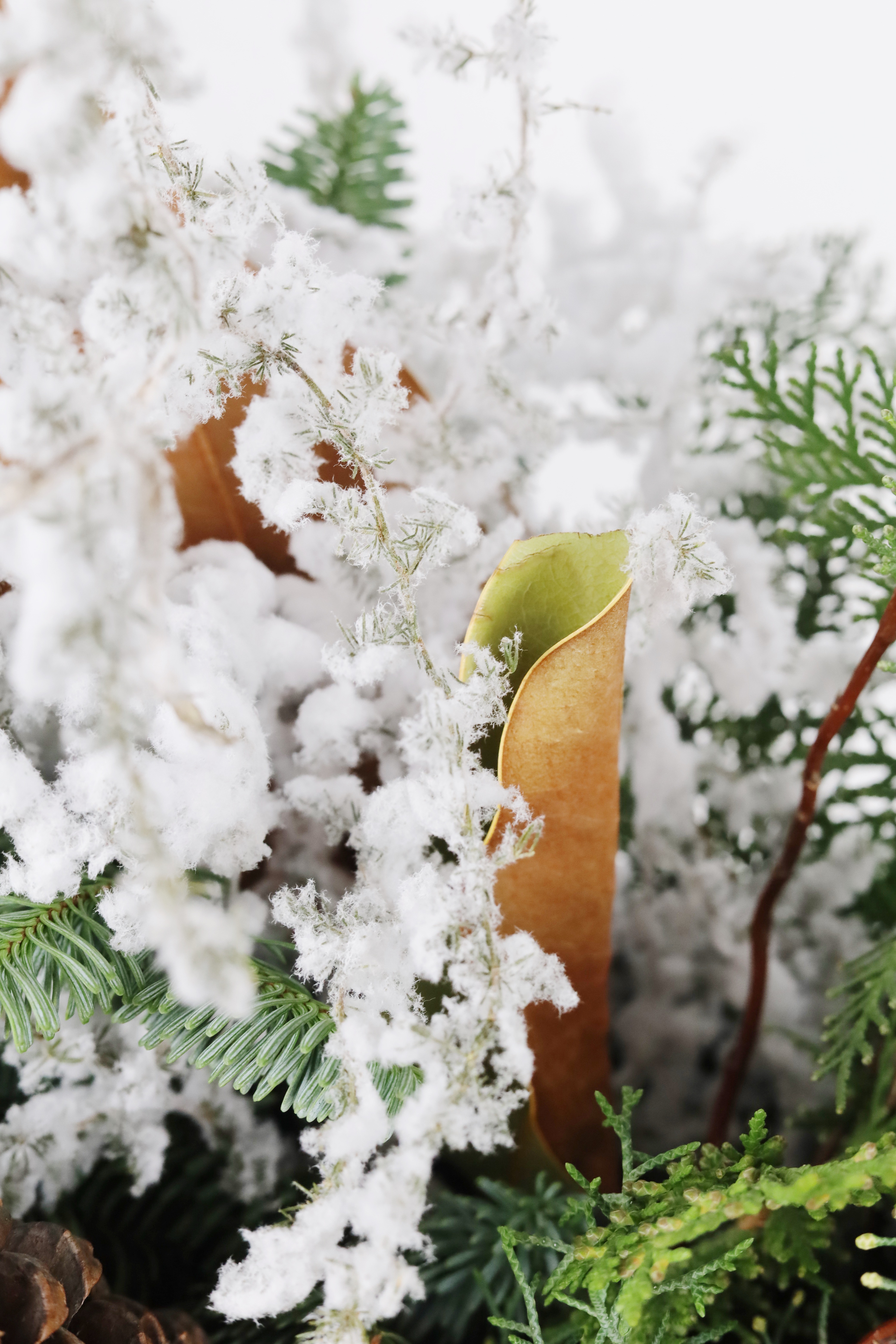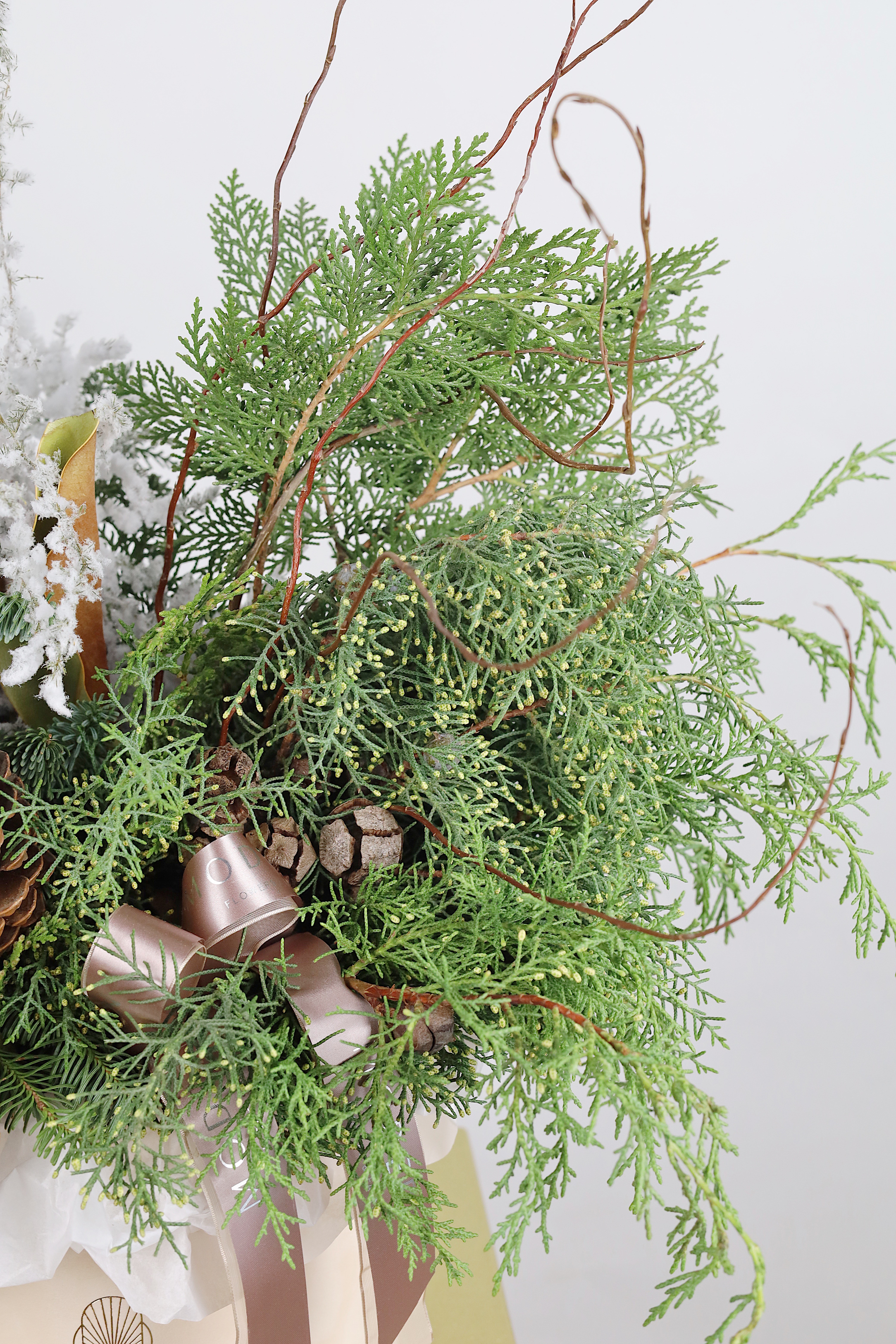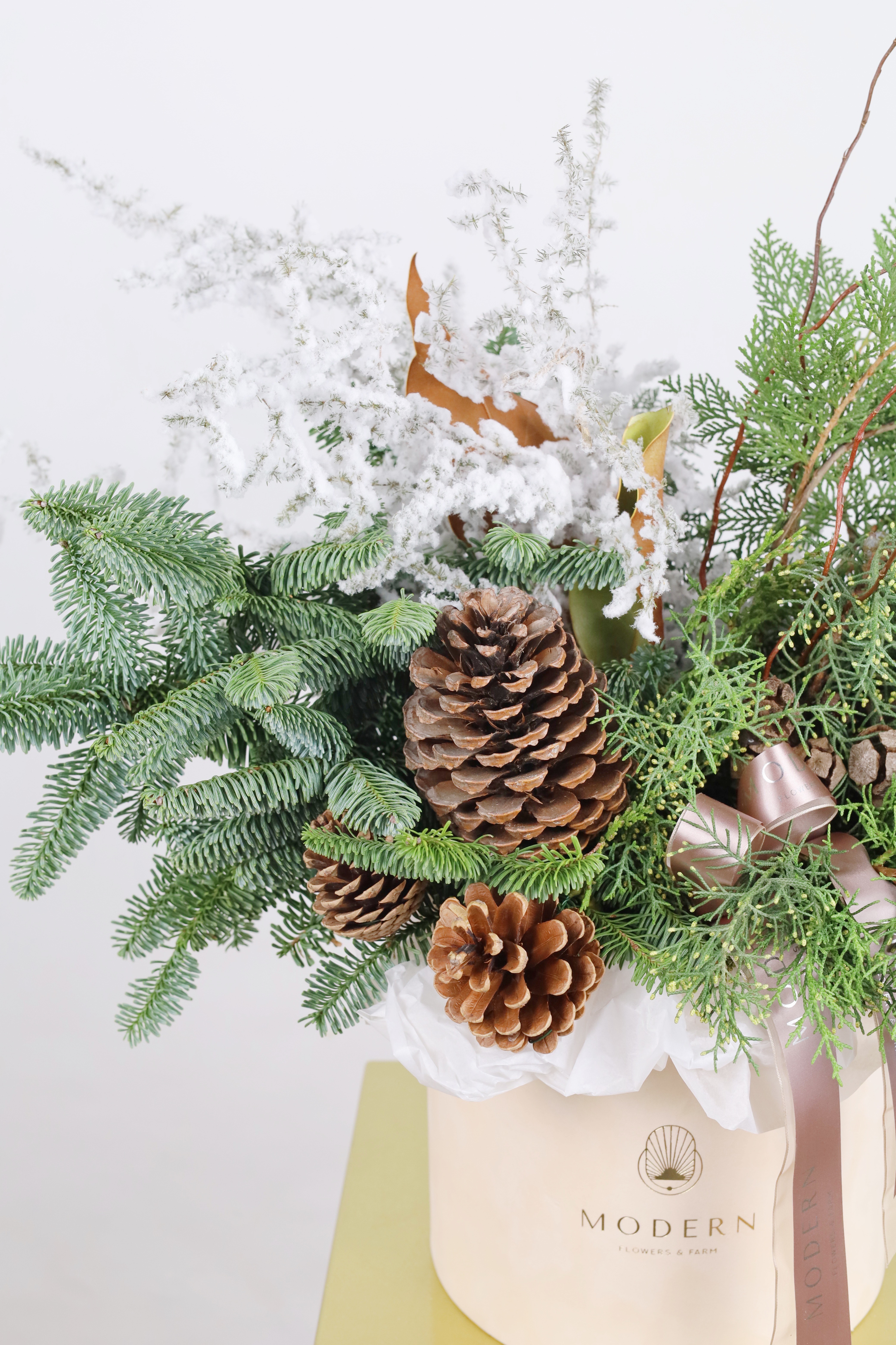—ХВОЙНЫЙ МИКС В БАРХАТНОЙ КОРОБКЕ С ЗАСНЕЖЕННЫМ АСПАРАГУСОМ И БОЛЬШИМИ ШИШКАМИ