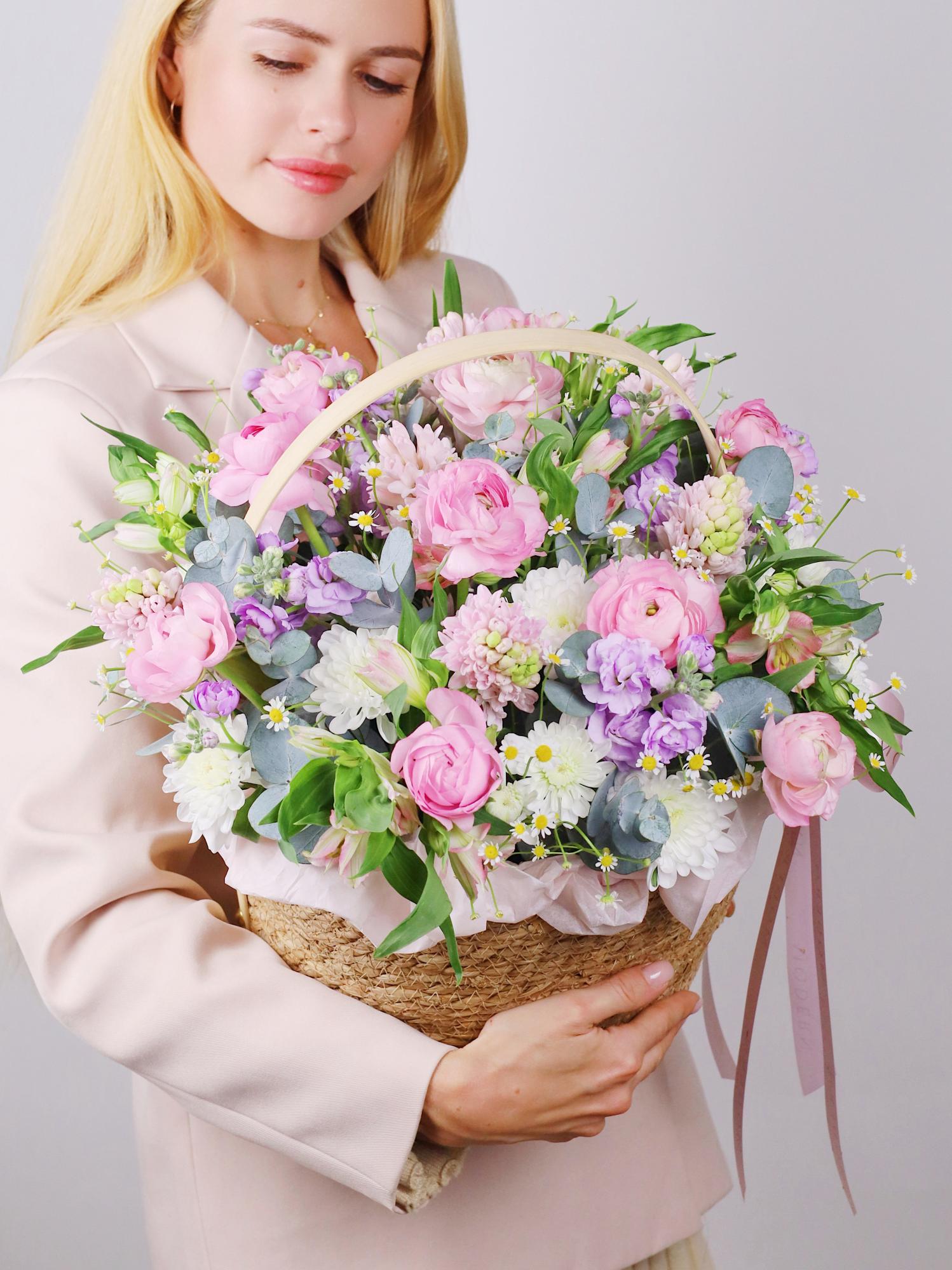 —КОРЗИНА С РАНУНКУЛЮСАМИ, МАТТИОЛОЙ И ЭВКАЛИПТОМ