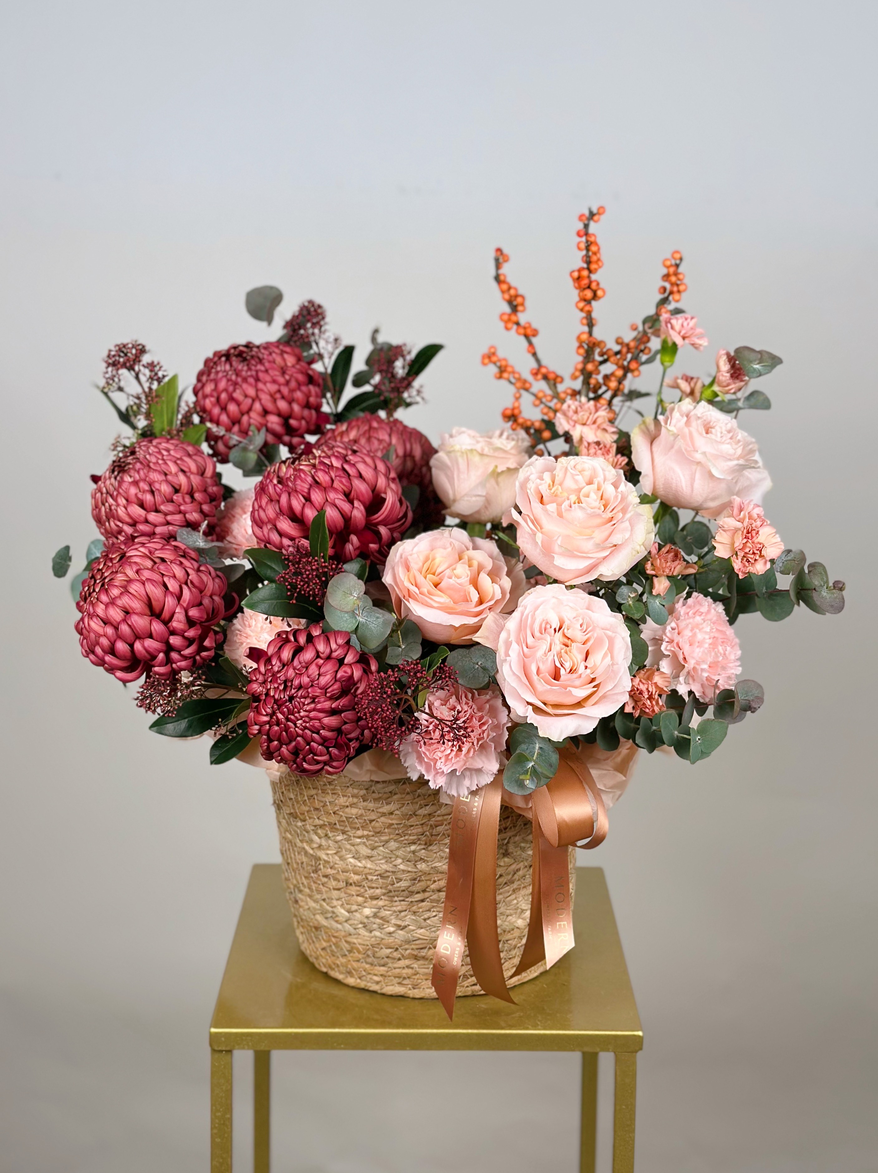 КОРЗИНА В ОСЕННИХ ТОНАХ С ПИОНОВИДНОЙ РОЗОЙ