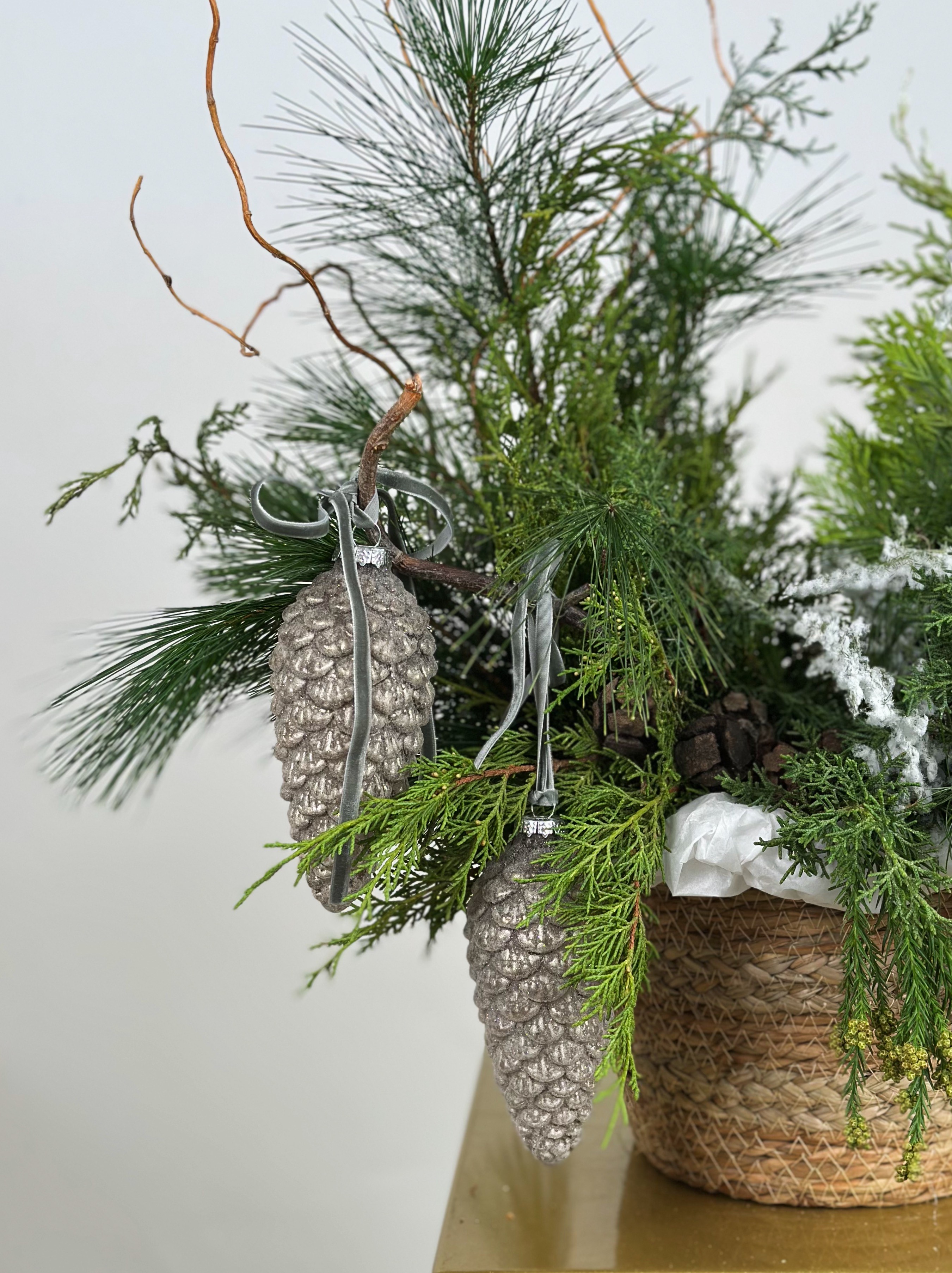 МИКС ХВОИ И ЗАСНЕЖЕННОГО АСПАРАГУСА В КОРЗИНЕ С ДЕКОРОМ